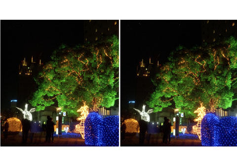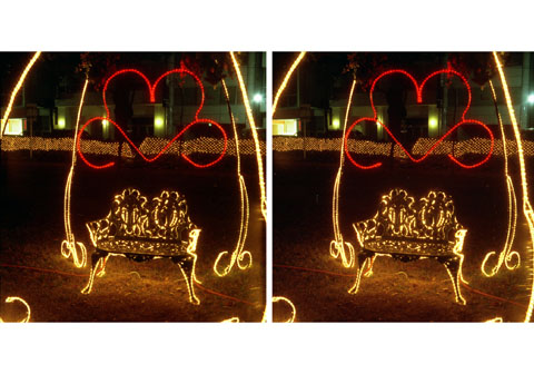 「ひろしまドリミネーション」とは,「おとぎの国」をテーマに,12月から1月にかけて平和大通周辺で催されているライトアップ事業である。ここでは3枚目の写真が,ステレオ写真としてのおもしろさがとくによく感じられるのではないだろうか。一見しただけではごちゃごちゃとした絵であるが,これを立体視すると,手前に伸びている枝や,意外と奥深い空間などが見えてくるはずだ。ただ,立体視のときの目安がみつけにくいので,比較的立体視しやすいと思われる2枚目や4枚目で目を慣らして,そのままの状態で3枚目を見るようにするとよいだろう。