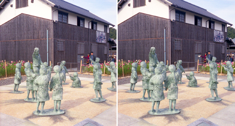 壺井栄の「二十四の瞳」の舞台になった「岬の分教場」の近くにある,映画村だ。ステレオ写真にしたときにその配置が楽しめそうな,先生と子どもたちが遊ぶ像をまず撮ってみる。周囲は小規模ながらコスモスが咲き乱れており,それらを組み合わせると,色彩的にも変化が出てきて,おもしろくなりそうだ。