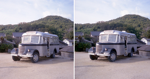 海岸へ出てみると,分教場の建物とボンネットバスが配置されている。ボンネットバスという「形」も,ステレオ写真にして立体視すると,おもしろそうである。