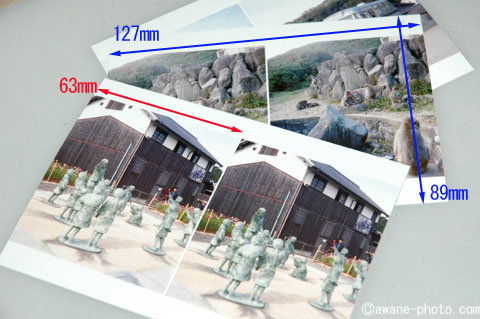 もっとも安価なプリントサイズは,サービスサイズのL判(89mm×127mm)であることが多いだろう。リアリスト判の1コマはほぼ正方形(23mm×24mm)なので,L判プリントに2つの正方形の画像が並ぶことになる。そのとき,1つの画像の大きさはおよそ63mm×63mmとなる。すなわち,2つ並べたときの画像に写った像の間隔もおよそ63mmになるわけで,ちょうど,平行法で立体視しやすい大きさになっている。