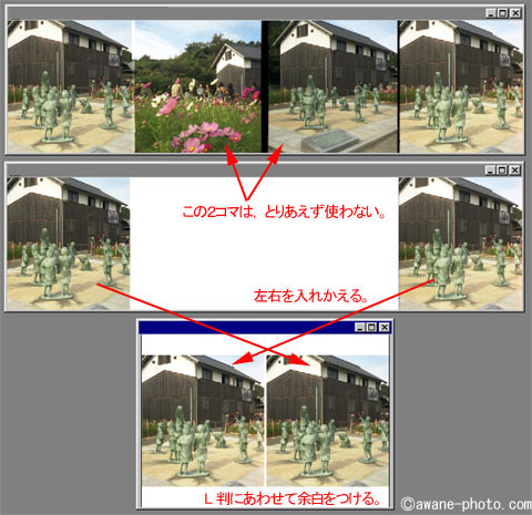 まず,並べた画像の左右の長さを,L判の長辺の長さ(127mm)になるように調整する。次に,画像の高さがL判の短辺の長さ(89mm)になるように,画像の余白をつける。