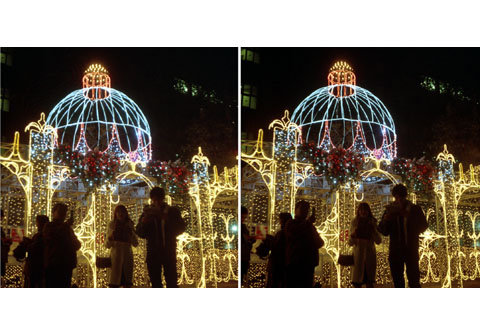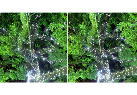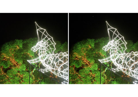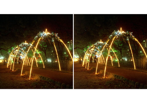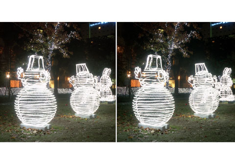 「ひろしまドリミネーション」とは,「おとぎの国」をテーマに,12月から1月にかけて平和大通周辺で催されているライトアップ事業である。ここでは3枚目の写真が,ステレオ写真としてのおもしろさがとくによく感じられるのではないだろうか。一見しただけではごちゃごちゃとした絵であるが,これを立体視すると,手前に伸びている枝や,意外と奥深い空間などが見えてくるはずだ。ただ,立体視のときの目安がみつけにくいので,比較的立体視しやすいと思われる2枚目や4枚目で目を慣らして,そのままの状態で3枚目を見るようにするとよいだろう。