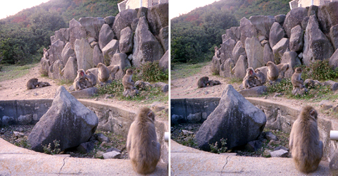 次に立ち寄ったのは「お猿の国」。数100頭のサルが餌付けされているとのこと。今日は望遠レンズを用意していないし,すでに明るさも十分ではないので,個々のサルの顔を撮ってもおもしろくない。こんなときは,サルの配置を立体的に楽しめるように,群れをKODAK STEREO CAMERAで撮ってみることにする。