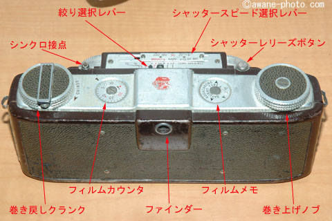 操作のためのノブ類は,カメラ上面に集中している。また,それらの配置は,左右対称を意識したものになっている。シャッタースピードは,Bおよび1/25秒から1/200秒が選択できる。フィルムカウンタは逆算式で,自動復元ではないのでフィルムを装填するたびに自分で設定する必要がある。